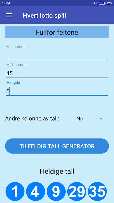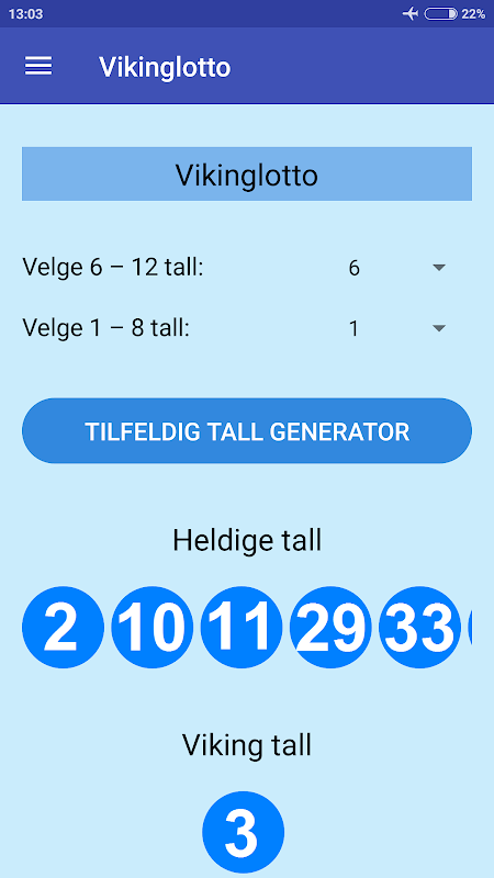 С помощью этого бесплатного приложения вы можете выбирать случайные числа для игр Norwegian Lotto, Vikinglotto, Eurojackpot, Keno и других лотерейных игр.