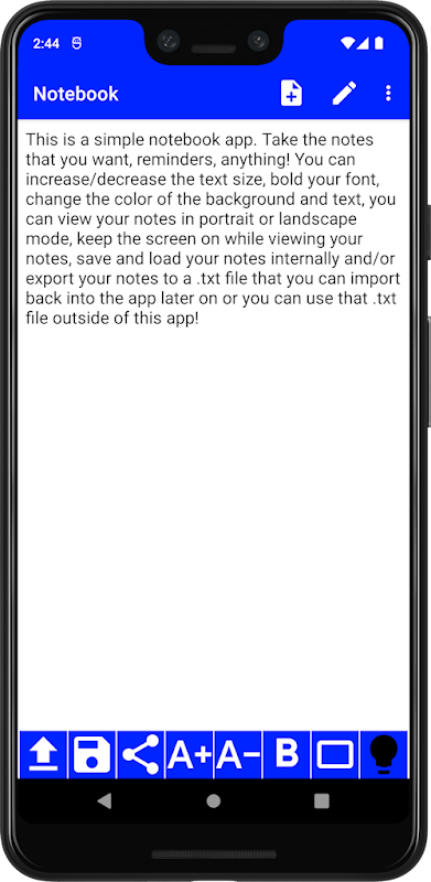 Это простое приложение для ноутбука. Делайте заметки, которые вы хотите, напоминания, что угодно! Вы можете увеличить/уменьшить размер текста, выделить шрифт жирным шрифтом, изменить цвет фона и текста, вы можете просматривать свои заметки в портретном или ландшафтном режиме (Примечание: в ландшафтном режиме запоминаются цвета фона и текста, а также настройки текста из книжного режим и будет отображаться так же!), держите экран включенным при просмотре своих заметок, сохраняйте и загружайте свои заметки внутри и / или экспортируйте свои заметки в файл .txt, который вы можете позже импортировать обратно в приложение, или вы можете использовать это .txt за пределами этого приложения!