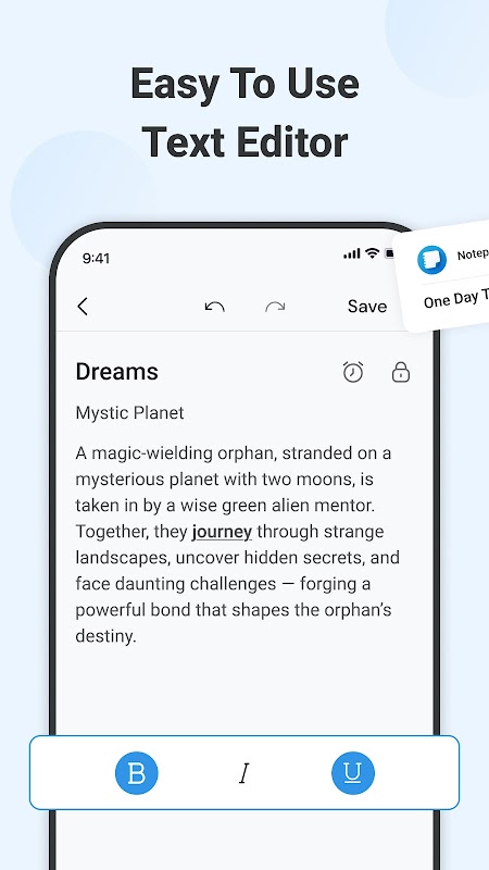Создавайте неограниченное количество заметок с лёгкостью. Выделяйте текст жирным, курсивом и подчёркиванием, чтобы выделить важное. Этот умный блокнот даёт вам свободу писать так, как вам удобно.
