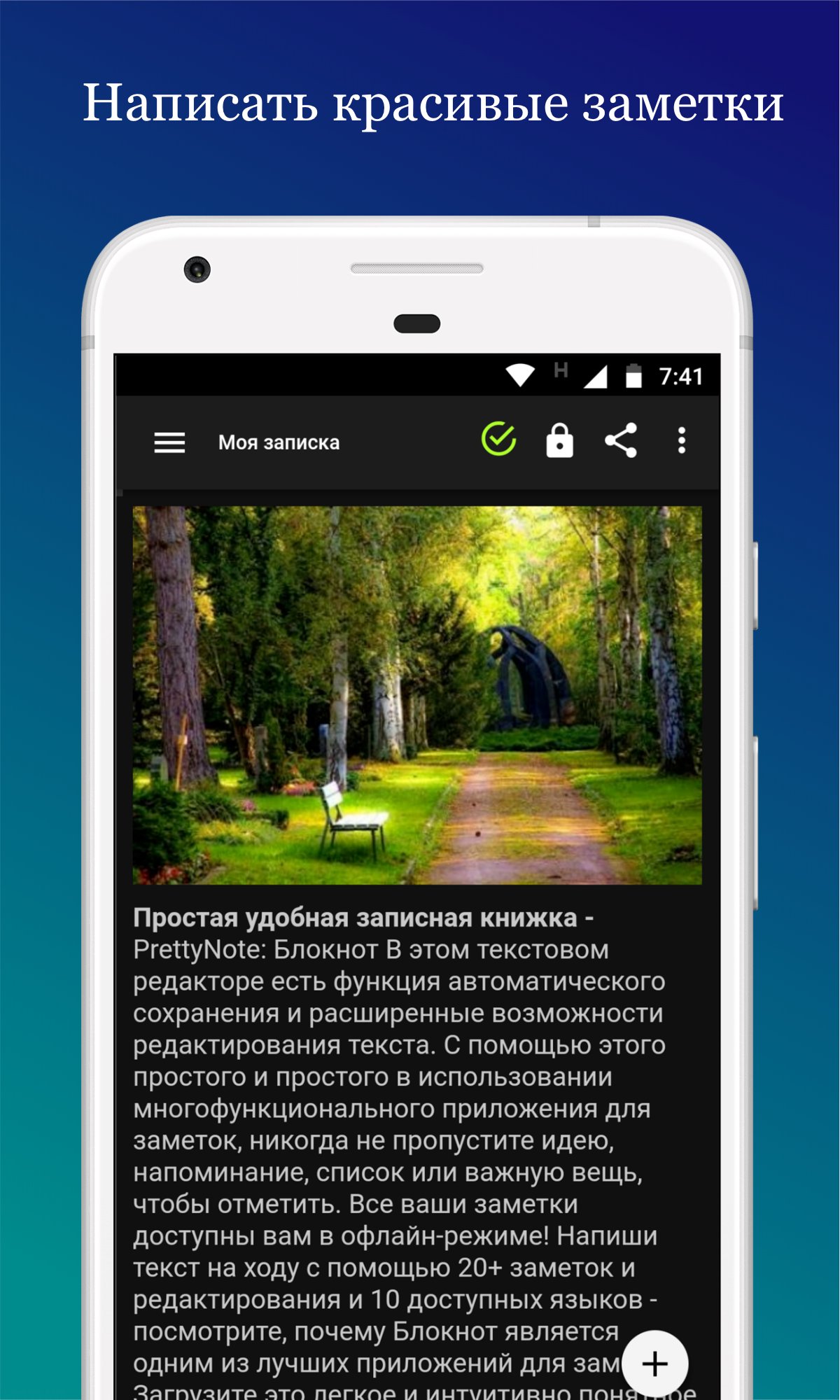 Простая в использовании блокнот. PrettyNote Notepad поставляется с функцией автоматического сохранения и расширенными возможностями редактирования текста. С помощью этого простого и простого в использовании многофункционального приложения для заметок, никогда не пропустите идею, напоминание, список или важную вещь, чтобы отметить. Все ваши заметки доступны вам в офлайн-режиме!Напиши текст на ходу с помощью 20+ заметок и редактирования и 10 доступных языков - посмотрите, почему Блокнот является одним из лучших приложений для заметок!Загрузите это легкое и интуитивно понятное приложение для заметок - превратите свой смартфон в гладкий и приятный инструмент для заметок.