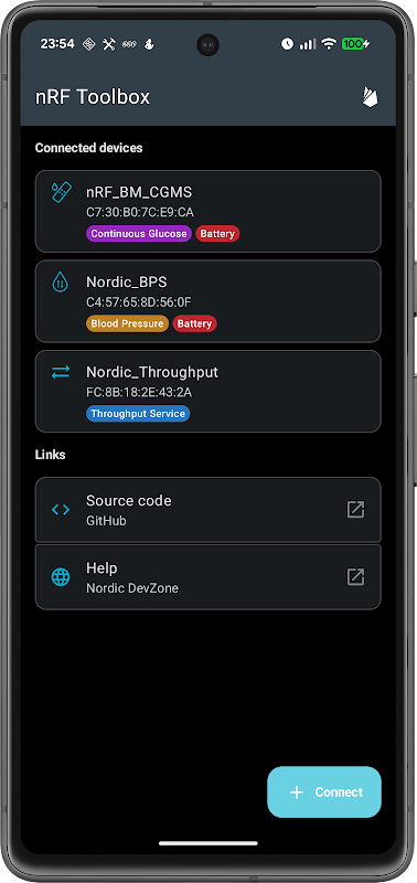nRF Toolbox — это простое в использовании приложение, поддерживающее несколько стандартных профилей Bluetooth, таких как пульс и уровень глюкозы, а также несколько профилей, разработанных Nordic.