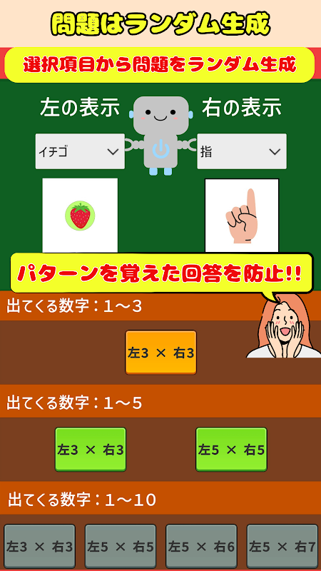 Метод обучения приложения заключается в соединении линий между двумя предметами, представляющими одно и то же число. Оно предлагает на выбор шесть типов элементов: конкретные объекты, такие как клубника или автомобили, числовые цифры, числа на пальцах и числа в хирагане и кандзи. Такой подход помогает в визуальном сопоставлении и понимании чисел, что делает его эффективным инструментом для обучения числам маленьких учеников.
