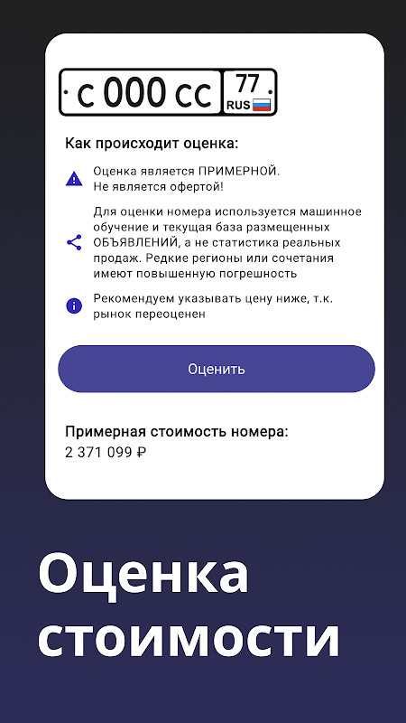 - Оценивайте примерную стоимость номера автомобиля. Мы используем машинное обучение для анализа цен.