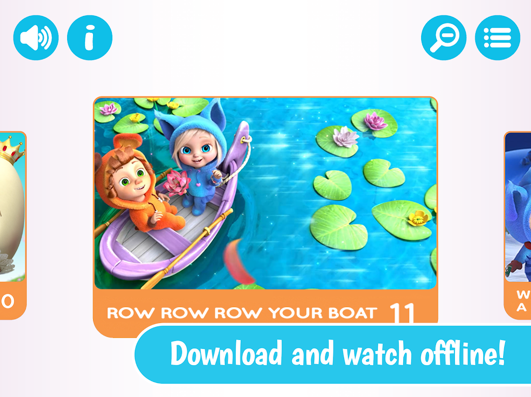 Приложение содержит более 100 видеороликов с YouTube-канала «Дэйв и Ава – детские стишки и детские песенки».