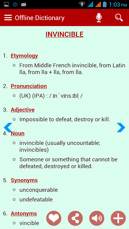 * Audio pronunciation : Hear the word only or its full meaning by just tap on speaker button.