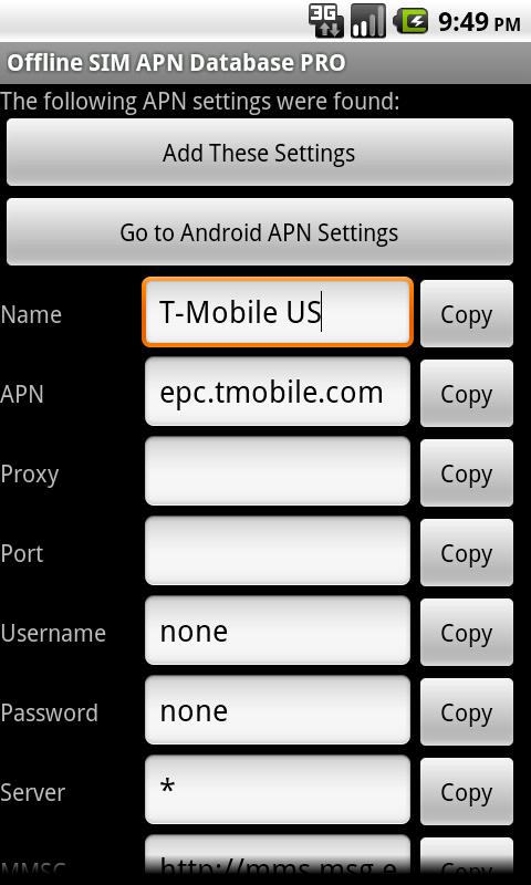 Это приложение содержит огромную базу данных известных настроек APN для сим-карт. Запустите приложение и искать настройки APN вашего сима. Тогда вы можете автоматически добавить эти настройки, или в случае мороженого пользователей Сандвичевых Скопируйте и вставьте индивидуальные настройки в новой записи APN.
