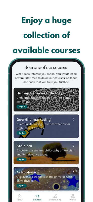 У вас есть доступ к сотням курсов, на которых вы можете узнать об истории, науке, искусстве, психологии, философии, экономике, бизнесе, духовности, религии и многих других дисциплинах, и все это в мобильном приложении, чтобы стать более культурным человеком во время игры.