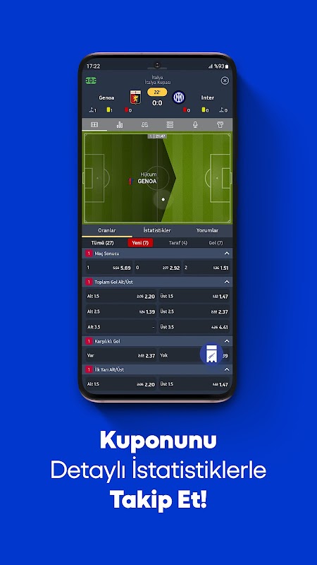 Вы можете найти все коэффициенты, изменяющиеся коэффициенты, игровые проценты, ставки Live, результаты матчей в реальном времени и результаты всех матчей в бюллетене iddaa в приложении Oley.com. Вы можете следить за купонами, в которые играете, вживую. Вы можете просмотреть наиболее популярные матчи и варианты игр и таким образом создать купоны для ставок.