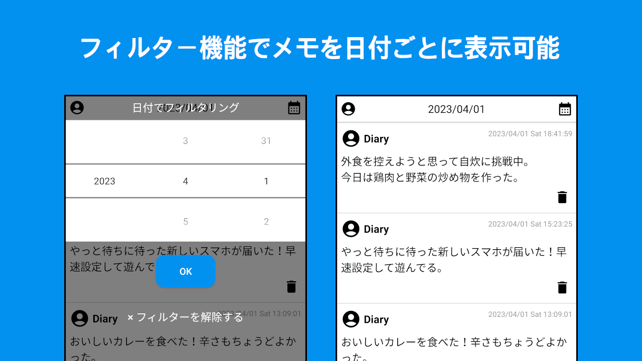 - Заметки расположены в хронологическом порядке, как SNS. Его также можно использовать как дневник.