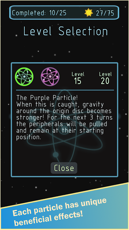 - Основной режим: Проходите готовые уровни, которые становятся сложнее по мере прохождения. Открывайте частицы с уникальными способностями. Собрать все 3 звезды для каждого уровня может быть довольно сложно. Вы готовы?