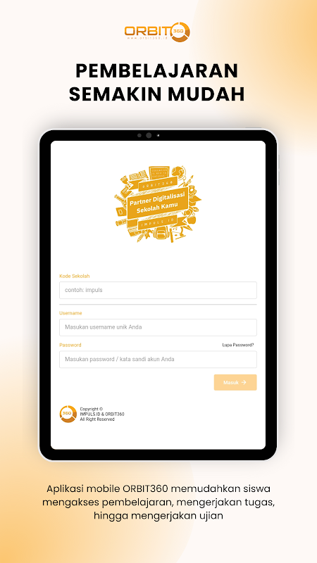 Наслаждайтесь превосходными функциями ORBIT360, включая функции обнаружения мошенничества (помогите учащимся быть более честными), функции анализа предметов (обеспечивайте качественные задания и экзамены), функции настройки учебной программы (K13 и Merdeka Learn), функции управления материалами, задания и экзамены (так же просто, как отправить электронная почта), функции электронного отчета (автоматический обзор результатов оценки), сотни учебных материалов и тысячи банков вопросов, специальные сеансы повышения квалификации для учителей.