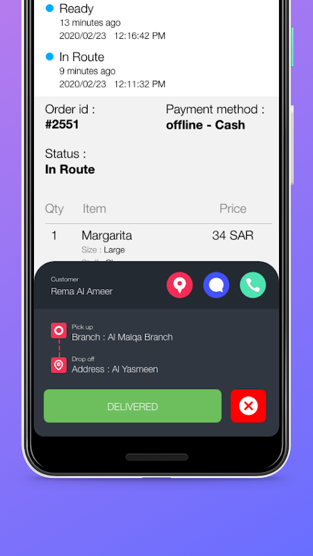 Application for drivers whos working at restaurants that uses Order system so they can recieve delivery orders that assigned to them.