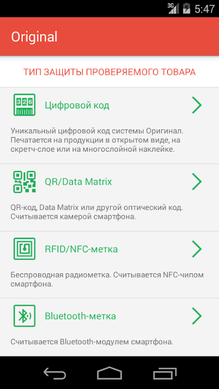Программа для проверки подлинности товаров, защищенных при помощи системы Original. Вы можете определить подлинность защищенного товара и получить консультацию в случае обнаружения подделки. Защищенный товар всегда снабжен инструкцией по проверке подлинности, размещенной на упаковке. Программа не работает с товарами, не защищенными системой Original.