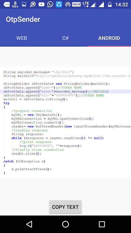This application will help web/c#/android/other os that support http request developers.developers can use this app to send generated otp to their user using their own phone.