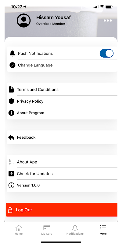 Приложение Overdose Loyalty Application позволит их участникам использовать свою учетную запись для выполнения следующих задач через свой мобильный телефон.