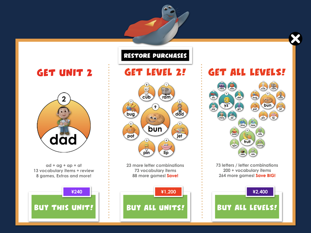 • Уровень 3 представляет различные варианты написания длинных гласных звуков (например, дождь, семя, ночь, лук, куб) и вводит более 75 новых слов.