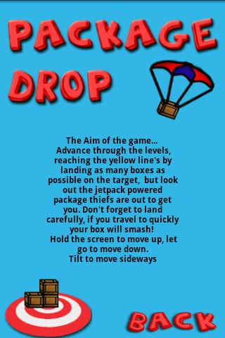 The Aim of the game...Advance through the levels, reaching the yellow line's by landing as many boxes as possible on the target, but look out the jetpack powered package thiefs are out to get you. Don't forget to land carefully, if you travel to quickly your box will smash!
