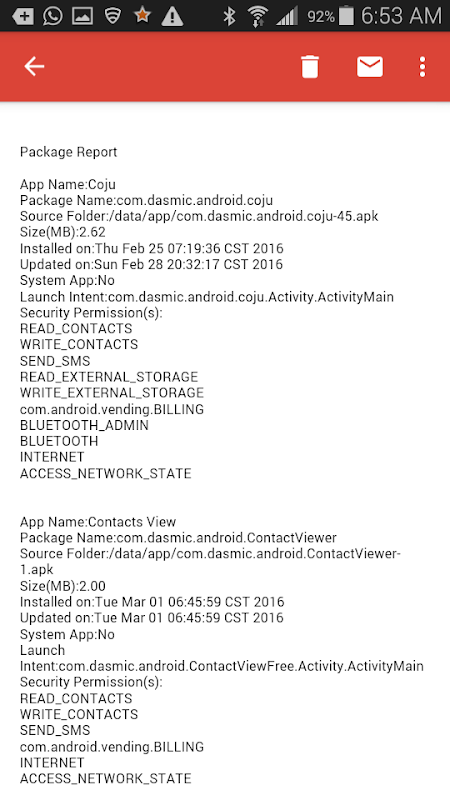 You can also view source folder, size, launch intent and detailed permissions of apps. If you need to send your apps directly to a friend over email you can do that with App Toolkit, and this feature also allows you to save the app to the cloud or external storage. Apart from this, App Toolkit also generates a detailed report for each app which can be saved to a file or sent over email.