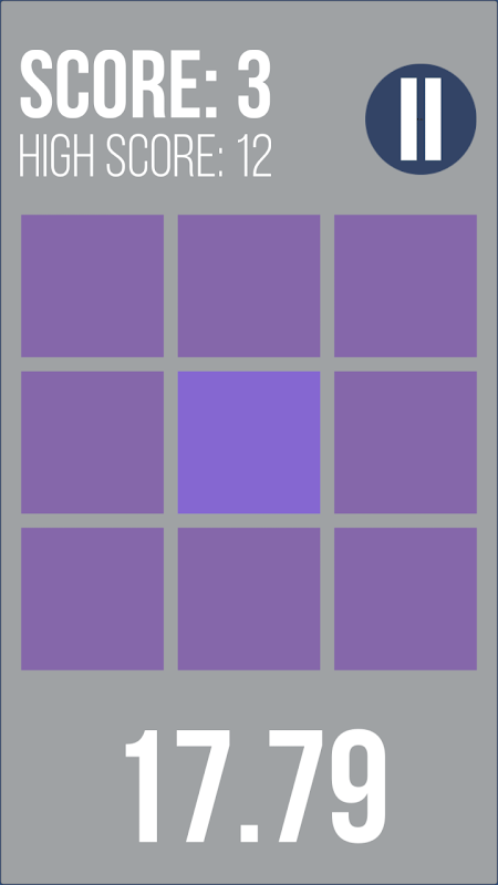 Every round, one of the nine squares will be assigned a color which is slightly different from the rest of the squares. Colors are randomly selected from an array of nearly 16.8 million colors to ensure a different experience each time you play! Find which square is different to earn a point. Choosing an incorrect square will deduct one second from the game's timer, and every ten correct squares will award the player with an extra ten seconds added to the timer.
