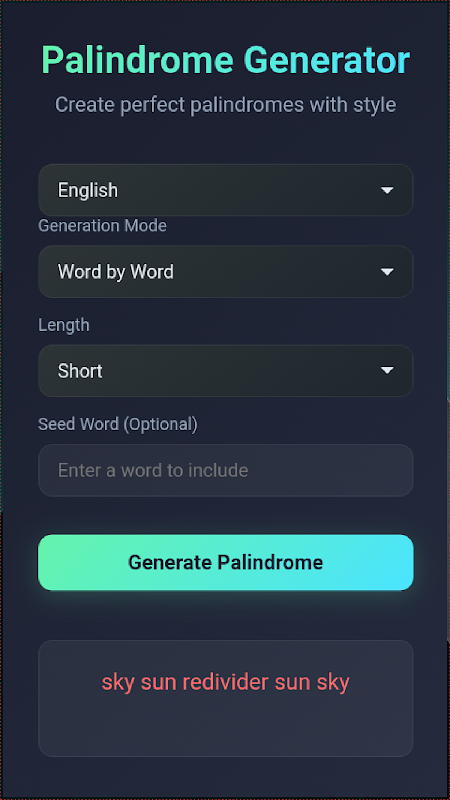 Приветствую, добро пожаловать в наше приложение. Это приложение-генератор палиндромов. С помощью этого приложения вы можете создавать идеальные палиндромы со стилем. Палиндром — это слово, фраза, число или другая последовательность символов, которая одинаково читается вперед и назад (без учета пробелов, знаков препинания и заглавных букв). Они часто используются в литературе, поэзии и даже в информатике. Спасибо за использование нашего приложения.
