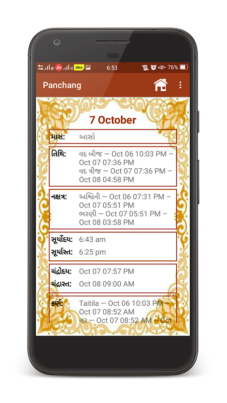 Это приложение Календаря Гуджаратского Panchang приносит вам ежедневно panchangam в Гуджарати, список праздников, гуджаратские фестивали, пуджи, культурные праздники и т.д. Это приложение Panchang отличный инструмент и должны использовать приложение для повышения производительности вашего дня с различными типами информации и инструментов ,