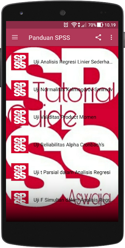 aplikasi ini dibuat atas inisiatif pengguna spss untuk membantu dalam memahami langkah kerja spss. aplikasi ini tidak terafiliasi dengan perusahaan manapun. tutorial yang ada dalam aplikasi ini diantaranya :