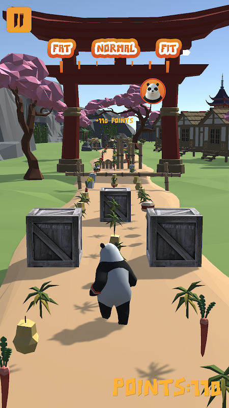 В игре представлены 15 увлекательных уровней-симуляторов панды, сделанных вручную, и множество увлекательных наград за рывок. Вы должны избегать препятствий, собирать монеты и одновременно есть здоровую пищу. Если вы начинаете есть нездоровую пищу, вы толстеете и становитесь медленнее, не можете прыгать достаточно высоко и двигаться достаточно быстро, чтобы избегать препятствий. Достигните цели, чтобы пройти все уровни, оставаясь в форме. Приключенческое путешествие с пандой начинается с острова, проходит в бамбуковый лес, пляж, болота, горы, пустыню и многие другие места и заканчивается в монастыре высоко в горах.