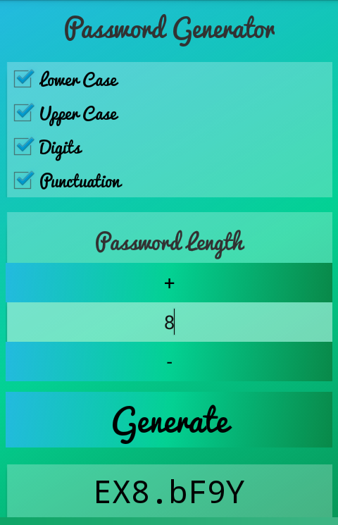 Password Generator is an app for generating secure passwords using cryptographic ally secure pseudo-random number generator. You are given options to choose which characters your password should contain or you can choose your set of a custom symbols. Generating passwords with Password Generator is fast and easy, just check options and hit a button.