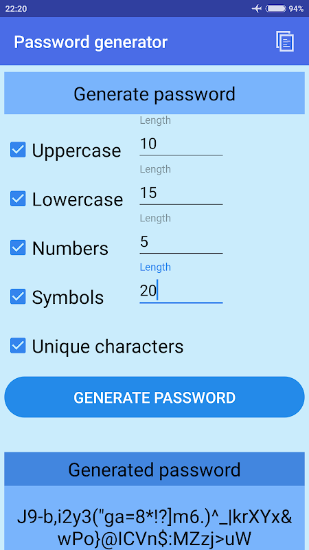 С помощью этого бесплатного приложения вы можете создавать надежные пароли. Вы можете выбрать, хотите ли вы прописные буквы, строчные буквы, цифры, символы, длину каждого из них и хотите ли вы, чтобы пароль содержал уникальные символы или нет.