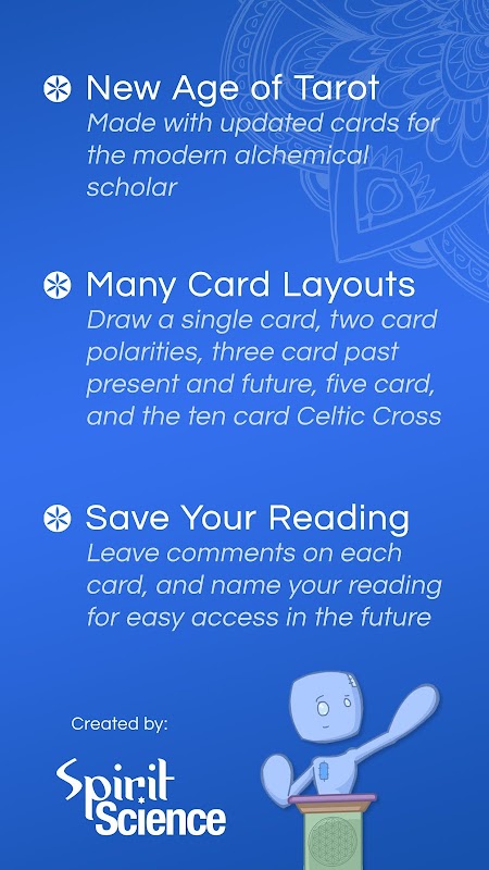 Чудо Таро Патча теперь доступно на вашем цифровом устройстве! Не всегда легко носить с собой всю колоду Таро, куда бы вы ни пошли. Однако вдохновение обратиться к ее мудрости возникает тогда, когда вы этого меньше всего ожидаете, иногда, когда колода недоступна. Мы рады сообщить, что теперь вы можете получить полный опыт Таро Патча прямо на своем мобильном устройстве; в любое время и в любом месте.