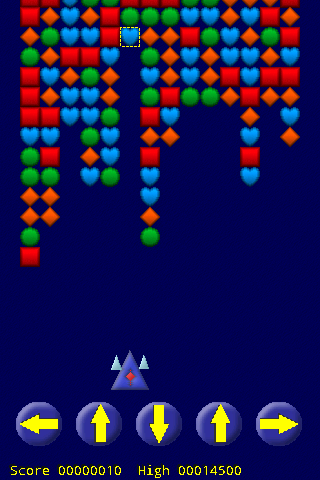 Race against time against an onslaught of falling blocks as you use the tractor beam of your ship to pull blocks down and shoot them back up. Connect five identical blocks together to clear them! Watch the stars, triangles, squares, circles, hearts, hexagons, and diamonds shatter! Simple, but addictive game play! A unique twist on the classic action puzzle genre!