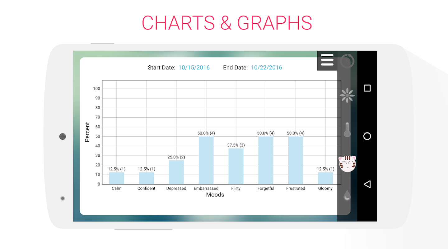 • простой способ отслеживать месячные, настроение, симптомы здоровья, вес, температуру, погоду, заметки, лекарства и беременность