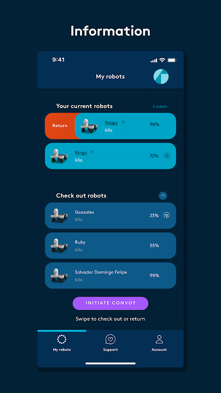 ИНФОРМАЦИЯ: будьте в курсе того, кто в вашей организации проверил робота, общее количество миль, которые проехал ваш парк роботов PFF-килограмм, статусы зарядки и блокировки, а также получайте важные уведомления.