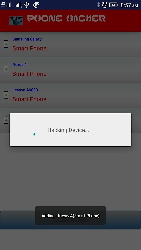 This Phone Hack Simulator app will loosen up all knots to show you what is present inside those devices. It just checks the Bluetooth connection of that particular device and hacks all the information present there in all folders and copies those into your phone. It will show you all the nearby devices whose Bluetooth connection is ON and its up to you who's device you want to expose !!!