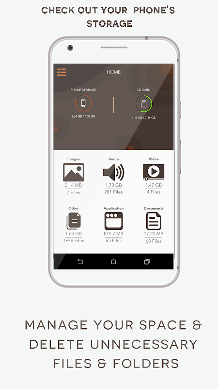 This app will help you manage your phone's storage and SD card's storage space. The app shows in details how much each file occupies space and storage occupancy categorized into