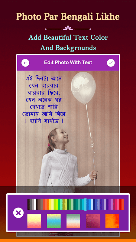 Write your emotions in your favorite Bengali language on your photos or backgrounds and share your photo with Bengali text with your friends and family via social media.