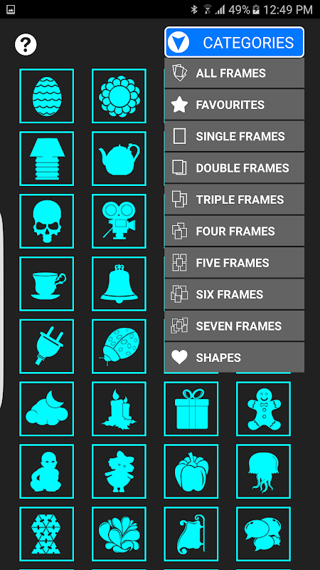 Если вы войдете в приложение, вы увидите слишком много коллажей фотоколлажей на выбор. Вы должны разделить эти кадры, нажав «Категории» на одиночные, двойные, тройные или формы. Вы можете установить в качестве любимого кадра долгим нажатием на него.