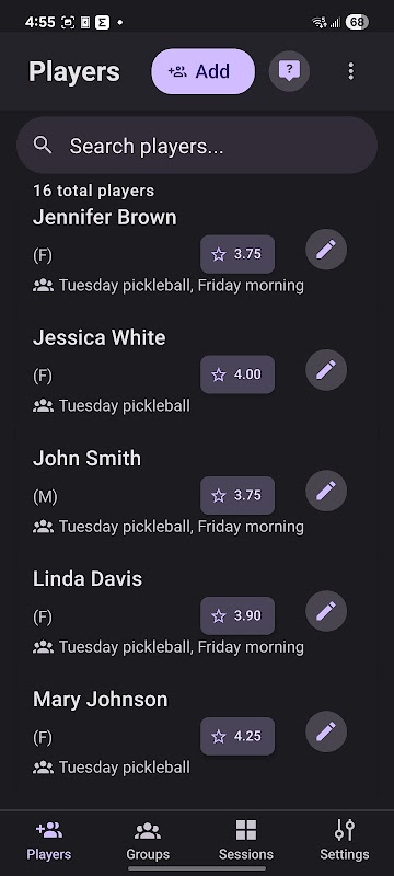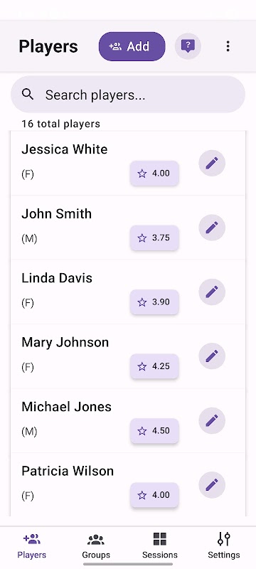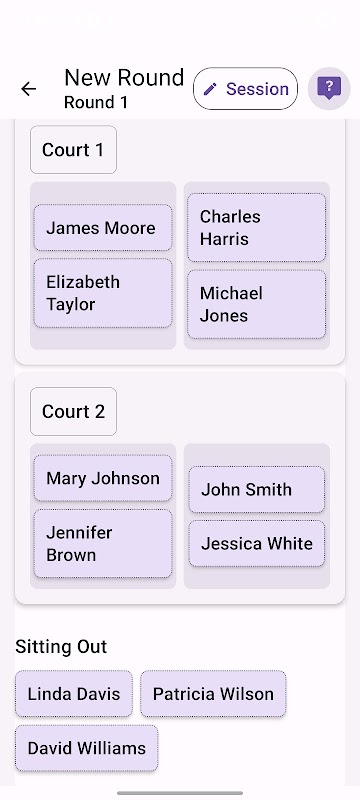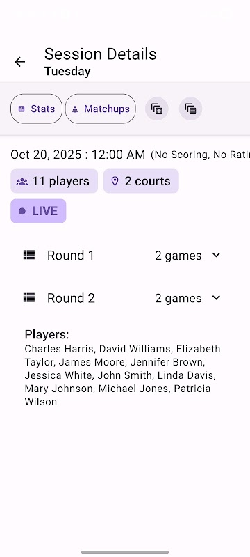 Pickleball Sessions помогает организовывать и управлять коллективными или соревновательными играми в пиклбол с помощью автоматической ротации игроков, балансировки команд и комплексного отслеживания сессий.