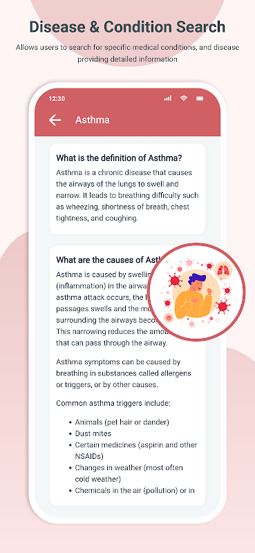 Поиск состояний и информация: позволяет пользователям искать конкретные заболевания, предоставляя подробную информацию о симптомах, причинах, факторах риска и распространенности.