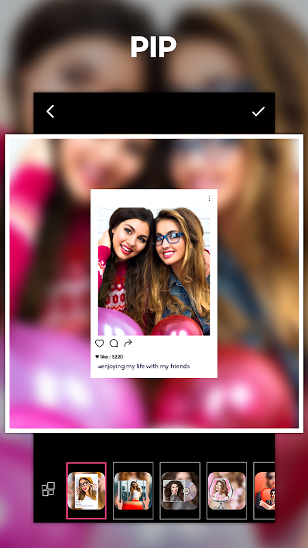 Примените картинку в рамке к своим изображениям, вы также можете изменить эти рамки PIP в любое время. Также вы можете контролировать интенсивность размытия фона. Применяйте такие эффекты, как винтажный или черно-белый, чтобы придать классный стильный вид. Наклейте наклейки или сделайте временную метку, написав на ней текст.