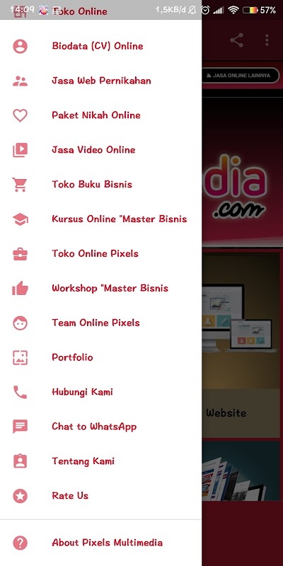 Aplikasi ini memuat informasi Jasa atau Produk yang ditawarkan Oleh PixelsMultimedia.com (Jasa Pembuatan Website, Jasa Pembuatan Toko Online, Jasa Pembuatan Video, Jasa Desain, Jasa Marketing Online, Mentoring Bisnis Online, eCourse, Mitra Bisnis Online, dll), dan juga disediakan info kontak kami jika anda ingin menghubungi kami berkaitan Jasa / Produk yang kami tawarkan.