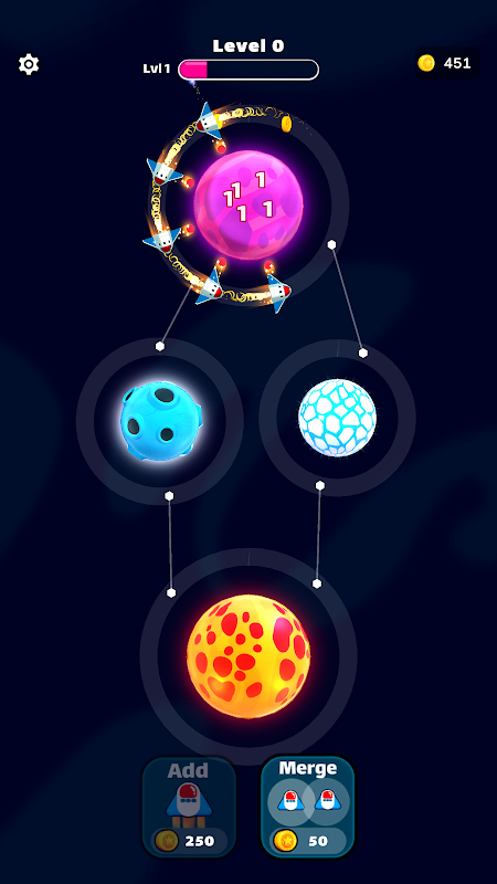 планеты становятся больше, если вы не будете управлять ими правильно, они взорвутся. Покупайте новые ракеты и объединяйте их, чтобы усилить свои ракеты!