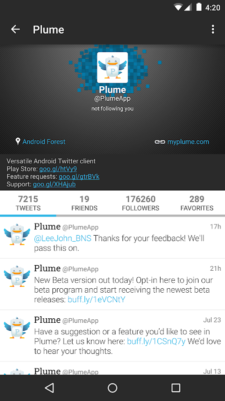 Plume - это красивое и полностью настраиваемое приложение для Twitter, которое революционизирует способ использования Twitter! Представленный авторами популярных виджетов Beautiful, Plume является одним из лучших клиентов Twitter для Android! (Плюм был ранее известен как Touiteur)