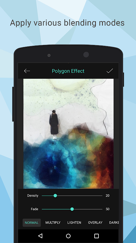 Просто выберите фотографию из галереи устройства и пусть веселье начинается. Поиграйте с различными слайдерами и опциями эффектов и когда вы закончите сохранить его и поделиться им! Полигон Effect позволяет вам быть частью искусства тенденции полигона и произвести впечатление на своих друзей в несколько простых шагов. Никаких сложных настроек и меню не для навигации по. С помощью Polygon Эффект отпирания свой творческий потенциал буквально у вас под рукой.