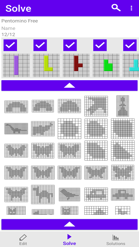 Polyomino Solver Pro решает фигуры с выбранным набором частей головоломки полимино и оценивает все решения.
