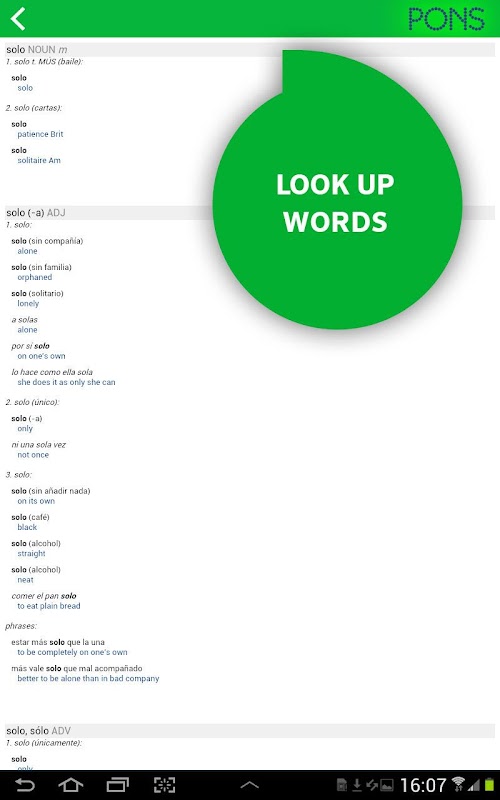 Сидите ли вы в поезде, ждете, пока загорится зеленый свет светофора, или бездельничаете дома на диване, вы можете использовать словесное приложение PONS SpellFlash, чтобы в любое время выучить свой словарный запас и весело провести время, делая это. Цель игры состоит в том, чтобы составить как можно более длинные слова из скопления букв. Чем длиннее слово, тем выше количество выигранных очков. Интеллектуальный интеллектуальный режим позволяет быстро и просто находить слова и искать их значения. Находите слова, собирайте очки и получайте высший балл!