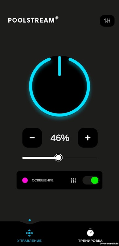 Приложение для управления противоточной системой Poolstream. Создание индивидуальных тренировок для плавания с экрана смартфона.