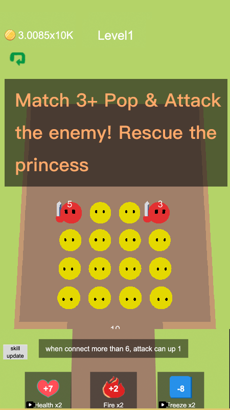Соберите 3 или более одинаковых по цвету Pop, а затем атакуйте врага.