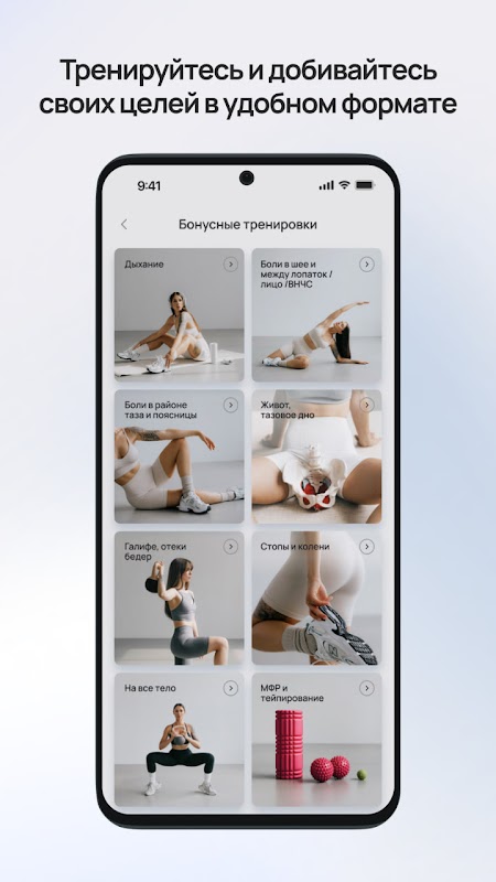 Уникальная "Папка бонусов" включает более 100 дополнительных материалов, таких как упражнения для снятия болей, комплексы для плоского живота и тазового дна, техники МФР для тела и лица, а также рекомендации по тейпированию и восстановлению после шрамов.
