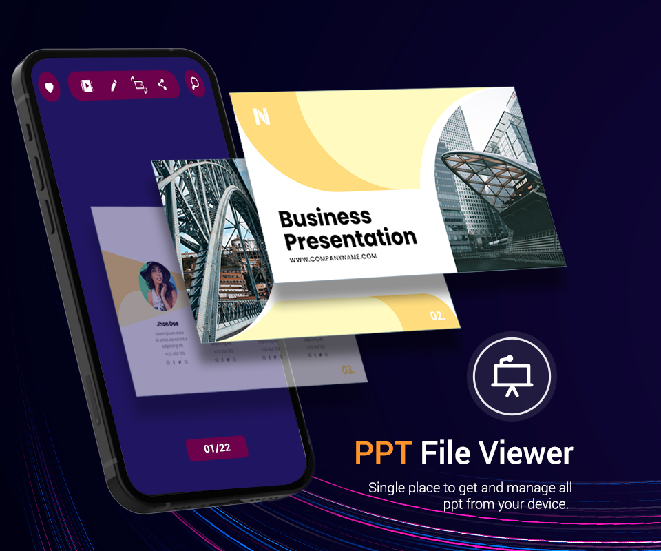 Here you find all PPT files on your phone in one place. Also view these files and highlight text using different colors, apply colors to background and also you can do presentation.